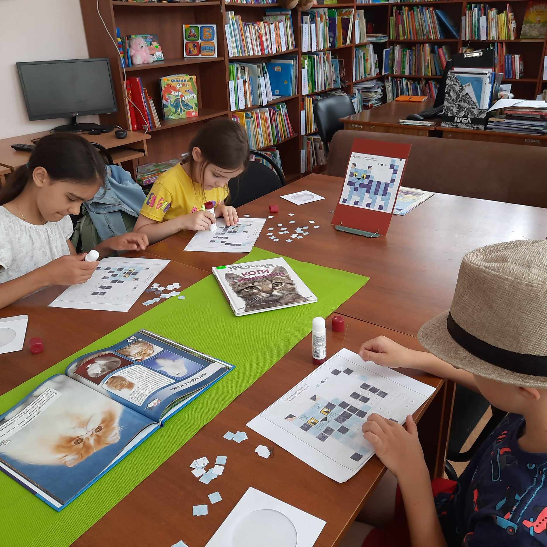 Діти дізналися про видатних українських митців: архітектора Аврама Мілецького і скульптора Костянтина Скритуцького, які створили найгарніше і найцікавіше місце для прогулянок в Києві - Пейзажну алею. Головними мешканцями алеї є сині коти. Тому дітям було запропоновано самостійно створити свого синього кота в техніці мозаїки з наліпок.