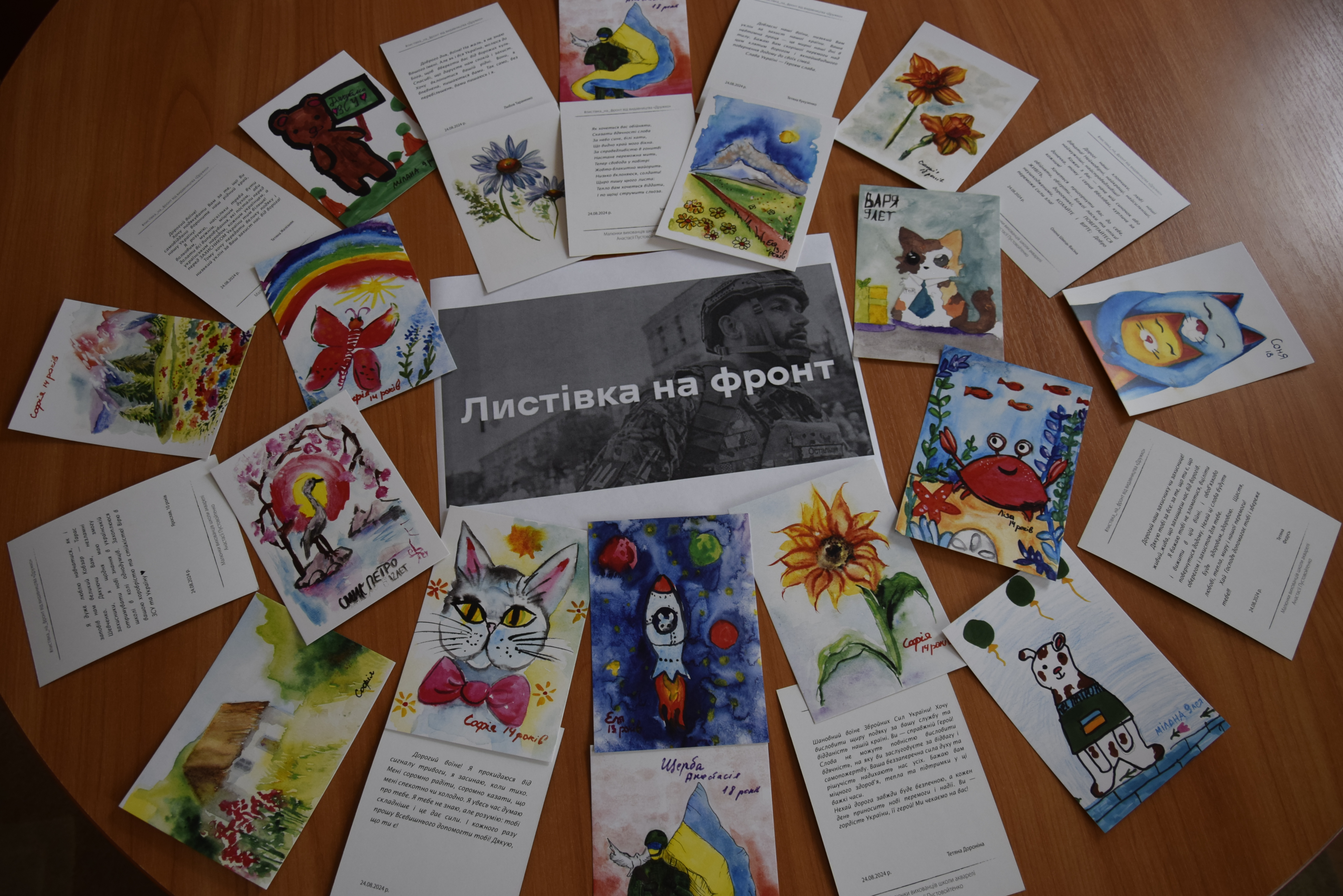 Завдяки партнеру проекту, Дитячій студії акварелі Анастасії Пустовойтенко, були створені ескізи листівок. На звороті кожної розмістили слова підтримки, вдячності та любові для наших хлопців.
