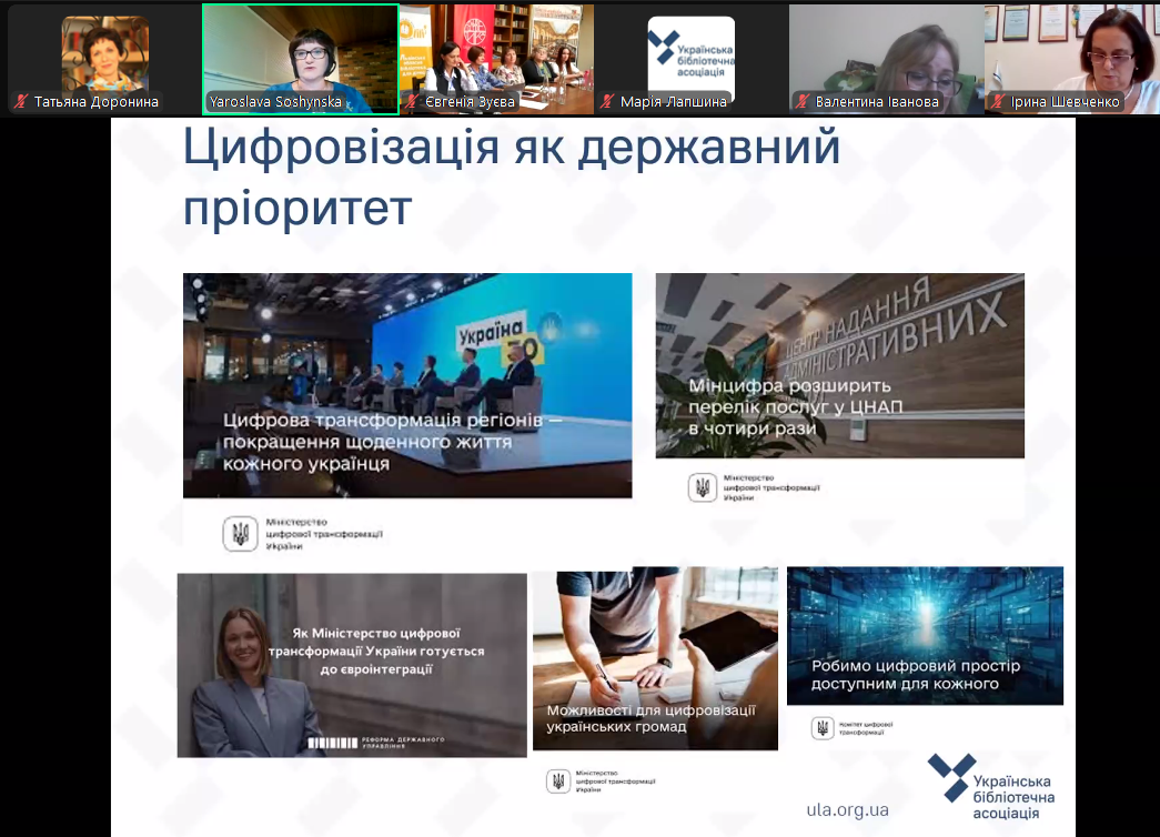 Виконавча директорка ВГО Українська бібліотечна асоціація Ярослава Сошинська розповіла про поточні результати реалізації проєкту «Здобуття цифрових навичок у бібліотеках – Хабах цифрової освіти». Ініціатива впроваджується упродовж травня – листопада 2024 року в усіх областях України у два етапи. Спершу організовується тижневе онлайнове навчання для координаторів Хабів цифрової освіти області. Заняття проводяться тренерами регіонального тренінгового центру для бібліотекарів, працівниками обласних універсальних наукових бібліотек та експертами-консультантами Асоціації. А координатори Хабів, своєю чергою, проведуть заняття із цифрової грамотності та нададуть консультації для відвідувачів бібліотек. У його межах, зокрема, розробили посібник «Бібліотеки – Хаби цифрової освіти», покликаний допомогти організувати ефективну діяльність Хабу цифрової освіти у бібліотеці. У травні липні 2024 р. тренери РТЦ навчали координаторів Хабів цифрової освіти (40 груп, це 1054 координатори Хабів з усіх областей).
