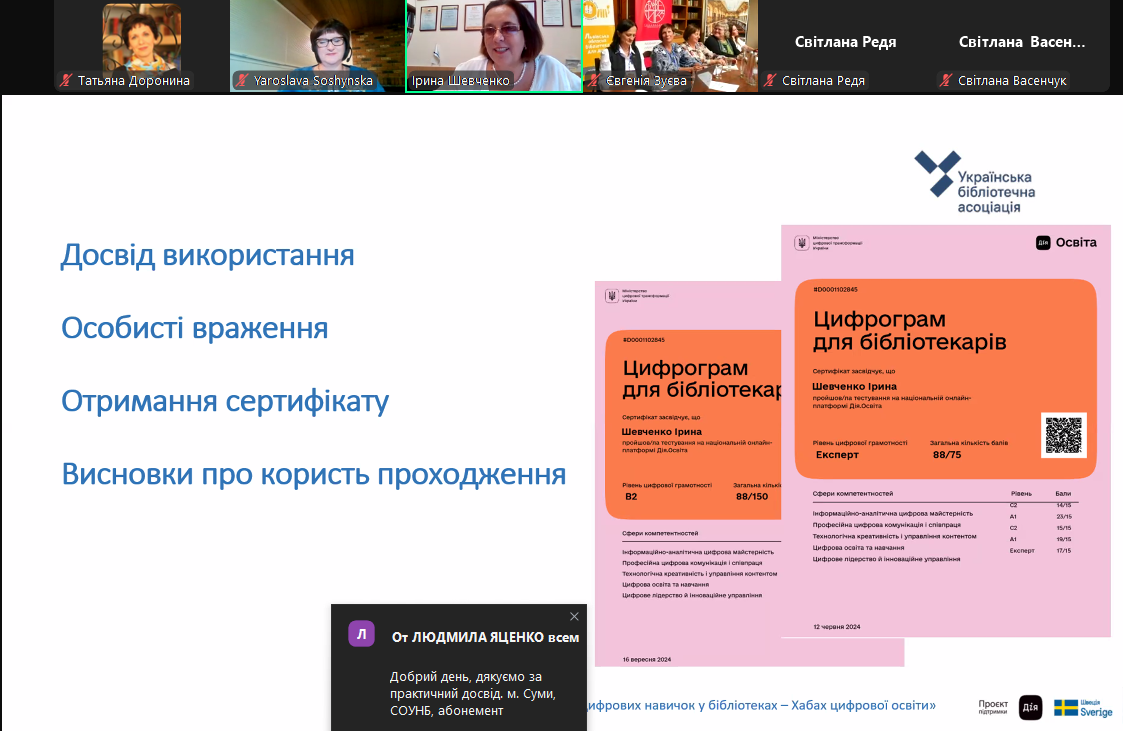 Ірина Шевченко, директорка Центру неперервної культурно-мистецької освіти Національної академії керівних кадрів культури і мистецтв, голова Секції з бібліотечно-інформаційної освіти ВГО Українська бібліотечна асоціація, разом з Оксаною Бруй, президенткою ВГО Українська бібліотечна асоціація, поділилися досвідом використання, особистими враженнями та користю проходження Цифрограм для бібліотекарів.