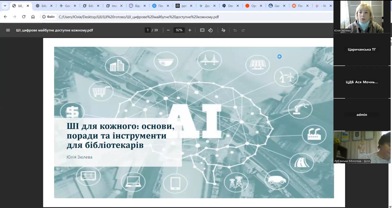 Фахівці Дніпропетровської обласної бібліотеки для дітей долучилися до онлайн вебінару «Штучний інтелект: цифрове майбутнє доступне кожному» , який провела учений секретар КЗК «Дніпропетровська обласна універсальна наукова бібліотека ім. Первоучителів слов’янських Кирила і Мефодія» Юлія Зюлева.
