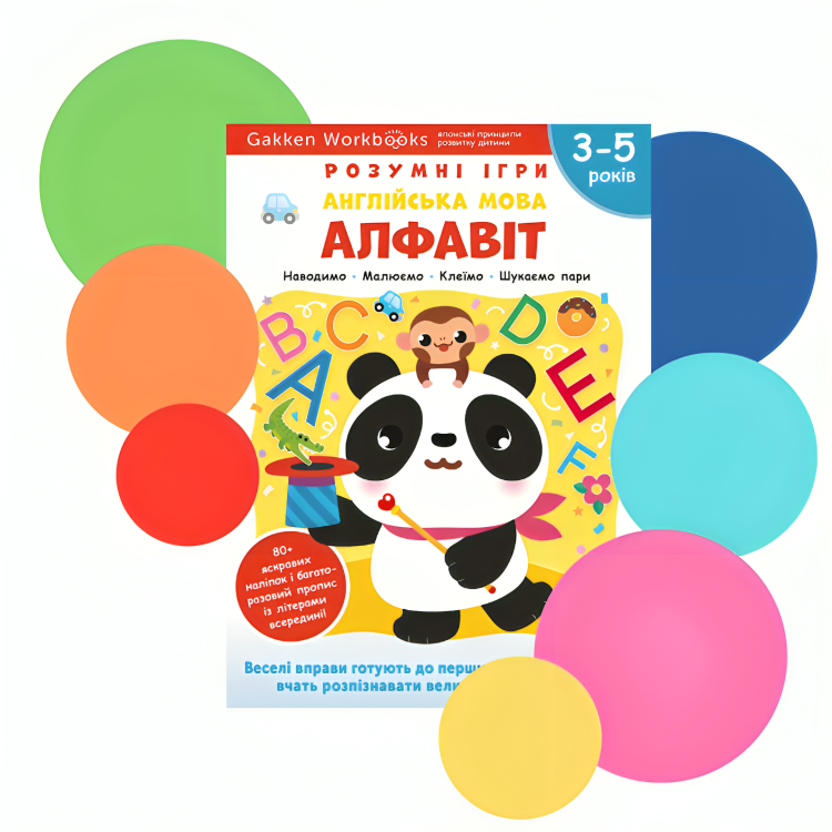 2. Англійська мова – Алфавіт: розумні ігри – посібник, розроблений за унікальною японською методикою вивчення іноземних мов для дітей від 3 до 5 років. Вправи в підручнику допоможуть зробити перші кроки в читанні, навчать розпізнавати великі й малі літери, відрізняти та співвідносити їх.