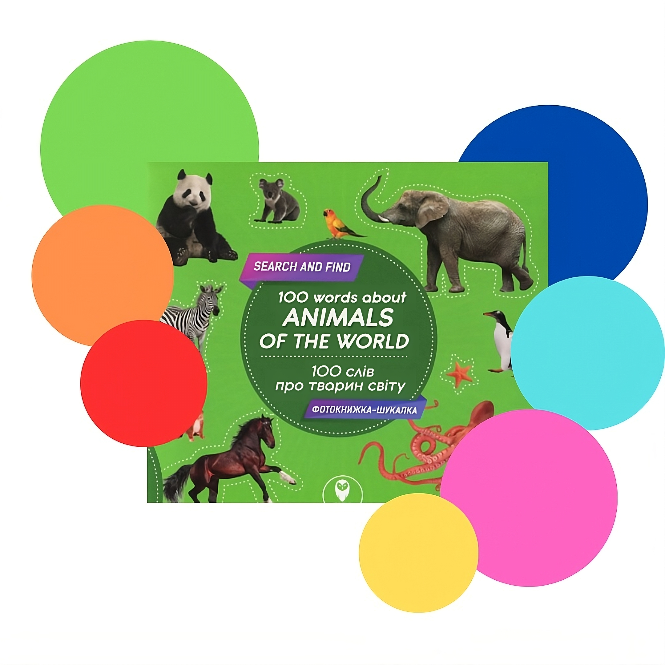 4. 100 words about animals of the World – дитяча книжка, створена у вигляді фотошукалки. Вона має зручний формат, багато яскравих зображень, цікаві ігри на розвиток уваги, пам’яті й мислення, а також корисні матеріали для вивчення англійських слів на тему «тварини, що нас оточують».